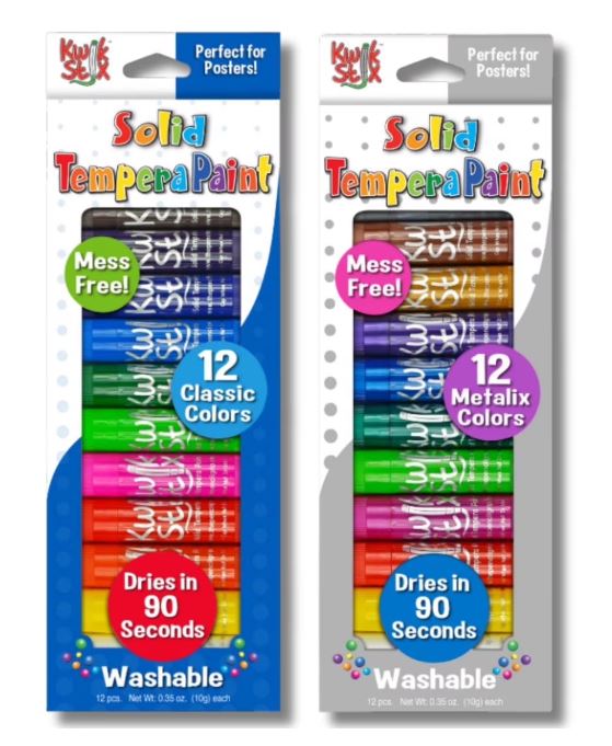 Two packages of Kwik Stix tempera paint sticks and solid tempera paint on a white background.